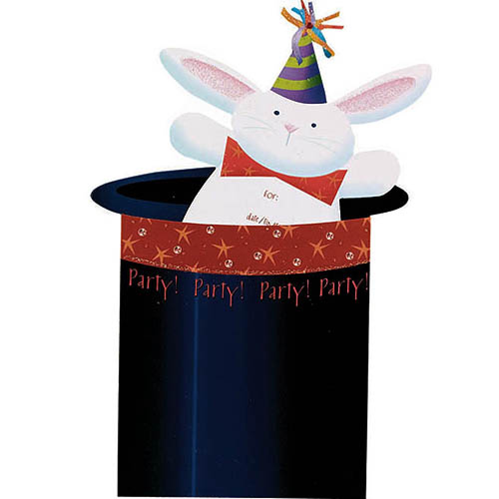 Abracadabra Jumbo Invitations features dark blue magician's hat with red band, orange stars and glitter accents