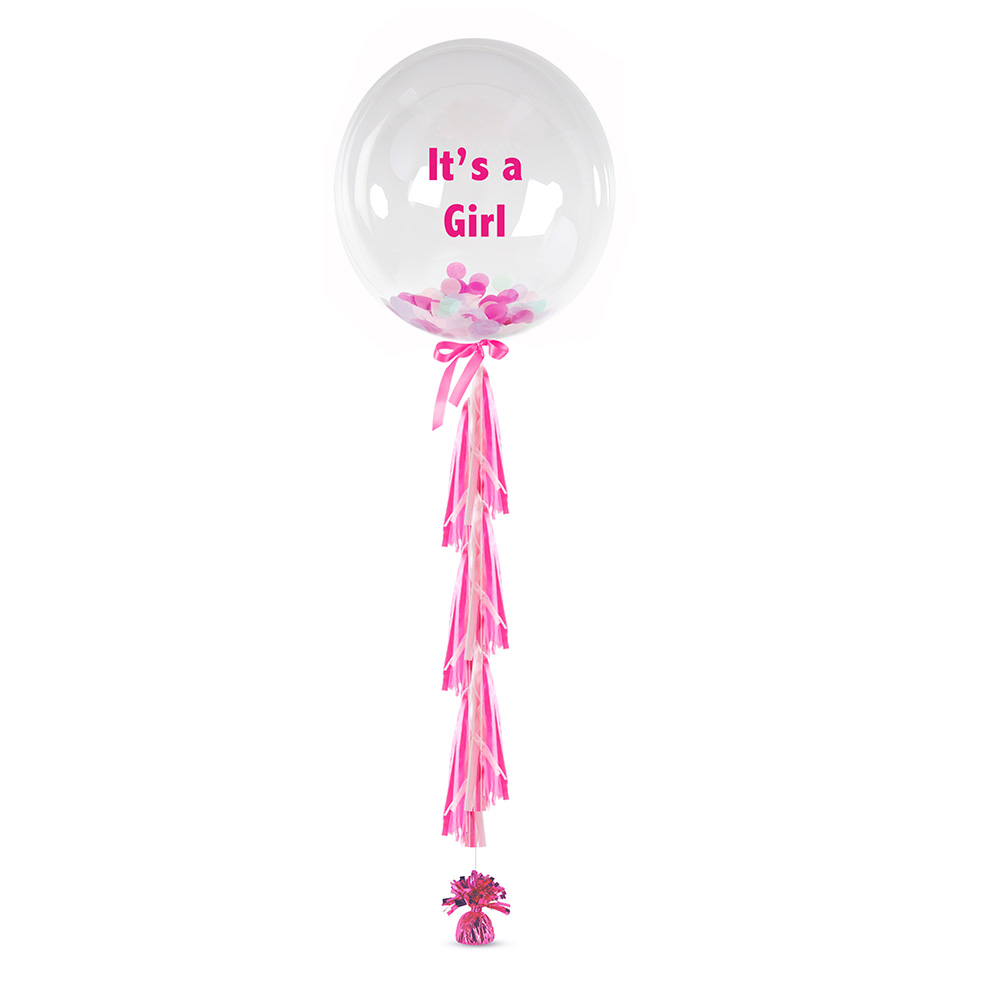 24 inch see-through bubble balloon, stretchy plastic material "It's A Girl" message in Dark Pink Sticker Filled with Round shapes confetti in Light Pink & Dark Pink Light Pink ribbon at the bottom of the bubble balloon Light Pink & Dark Pink Long String paper garland Tassels to matched the theme Dark Pink weights to hold the balloon All balloon are inflated with helium