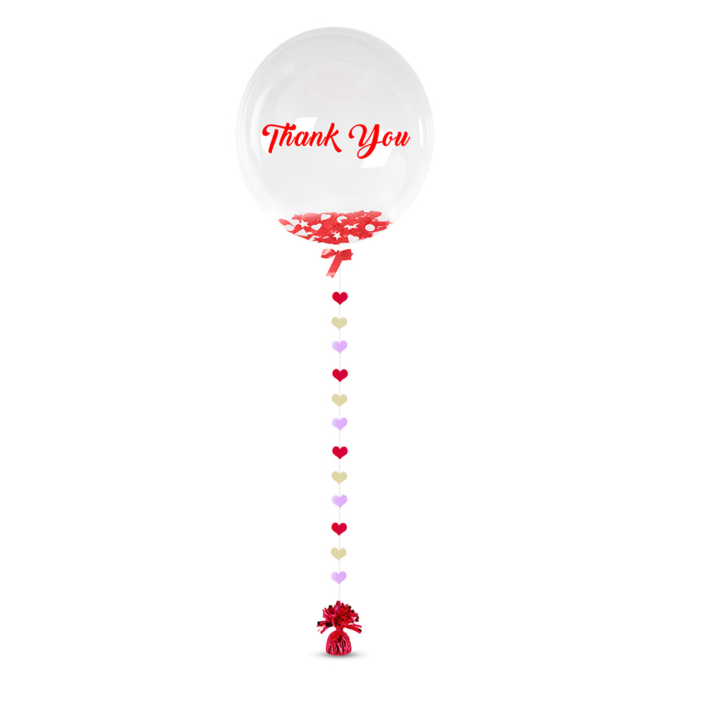 24 inch see-through bubble balloon, stretchy plastic material "Thank You" message in Red Sticker Filled with Mixed Shapes confetti in Red & White Red ribbon at the bottom of the bubble balloon Heart Shape design paper garland strings to matched the theme Red weights to hold the balloon All balloons are inflated with helium