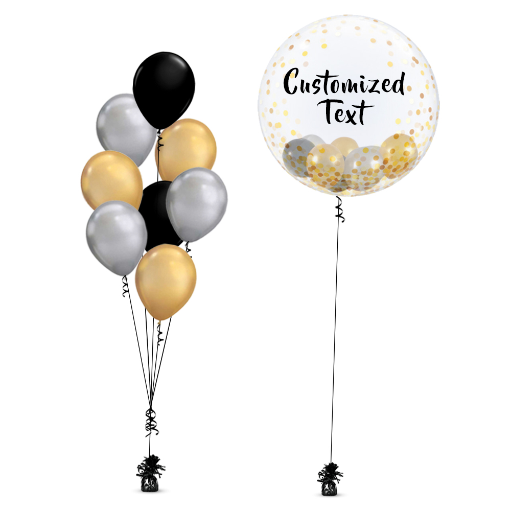 Filled with 5 piece 5 inch Balloons in Gold, Silver and Black