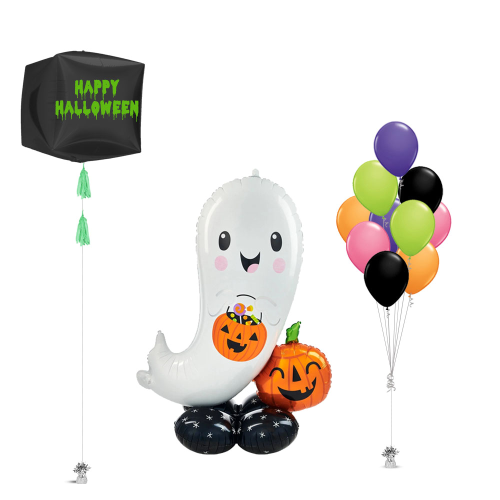 1 piece 18-inch Black Cube Balloon with the message "Happy Halloween" in Lime Green and a tassel at the bottom