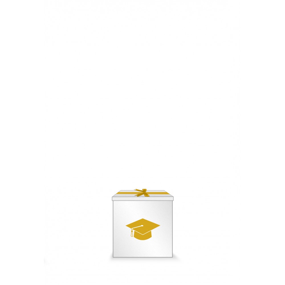 1 piece 50cm by 50cm White Small Gift Box with ribbon and “Graduation Hat” Message outside the box in Gold sticker