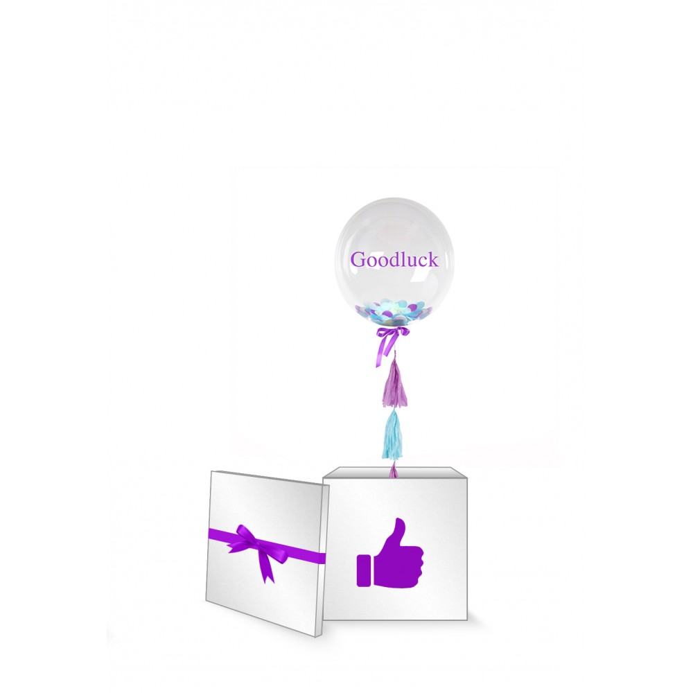 1 Piece 24 inch Clear Bubble Balloon, Stretchy plastic material with “Goodluck” message in Purple Sticker