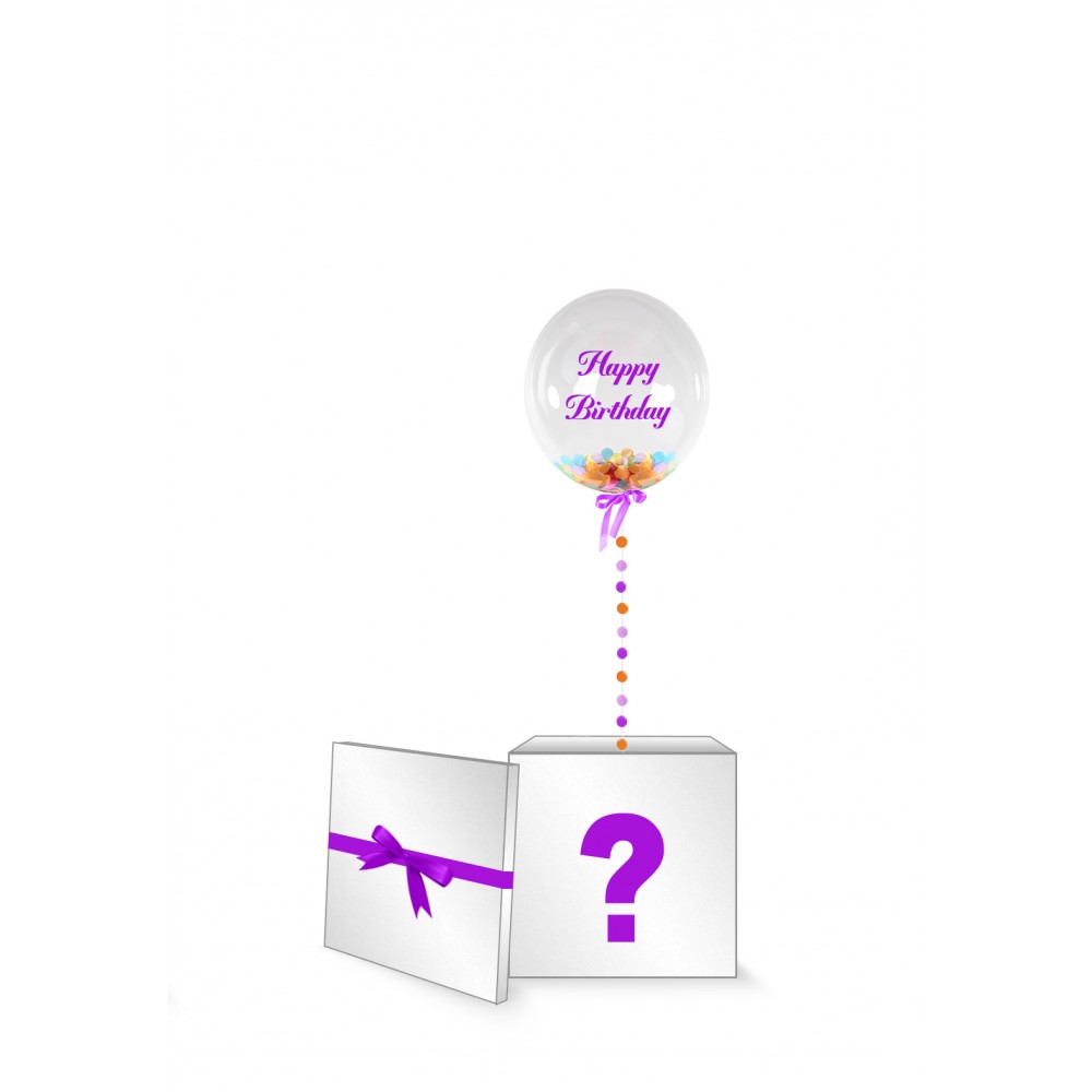 One 24" Bubble balloon filled with round shapes confetti in Orange, Red, Light Blue, Yellow and Lime Green and "Happy Birthday" message sticker in Purple