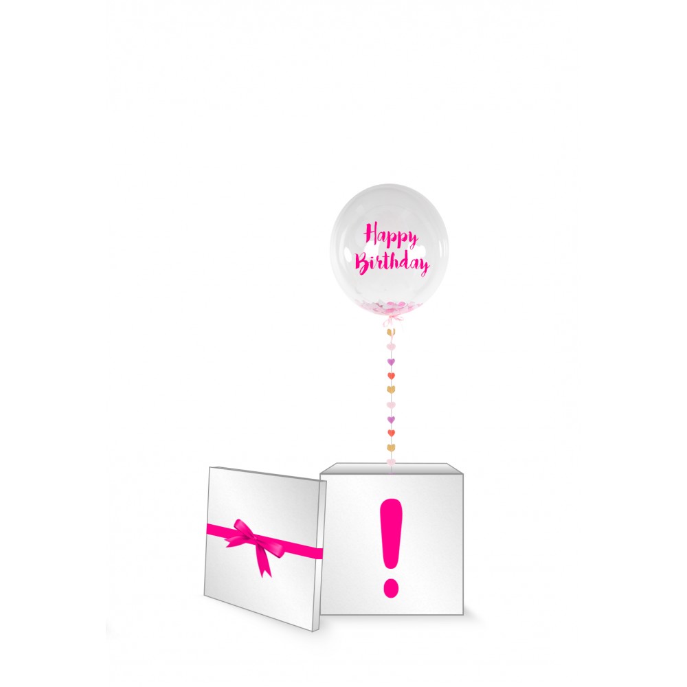 One 24" bubble balloon Filled with Mixed Shapes confetti in Light Pink, Dark Pink and White and "Happy Birthday" message in Dark Pink Sticker