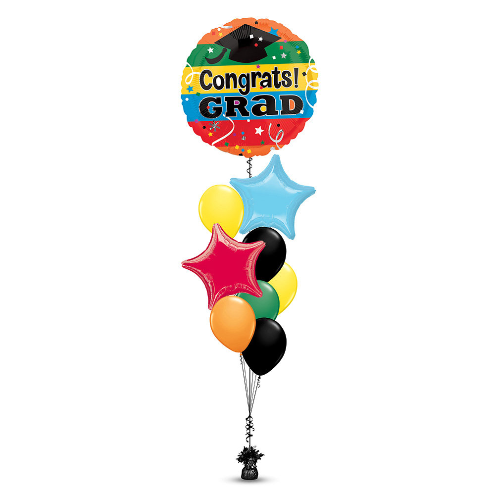 1 Piece multi-colored strips, colorful stars, white confetti swirl design Congrats Grad foil balloon
