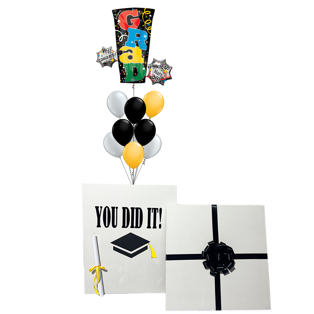 1- white surprise box with hat cut out and black sticker " YOU DID "